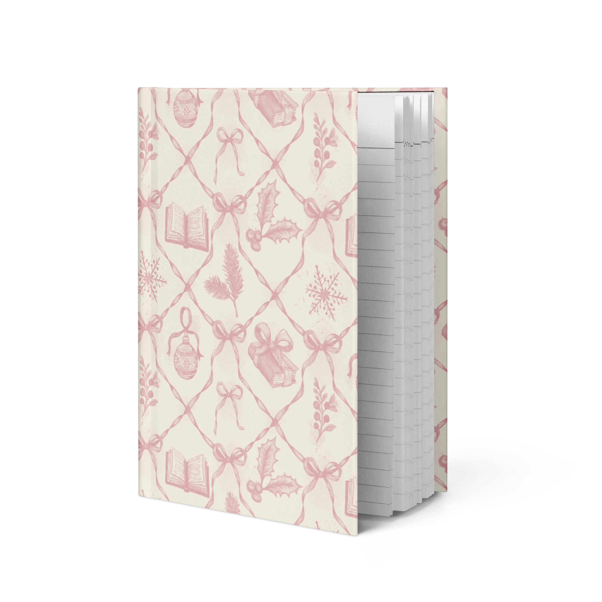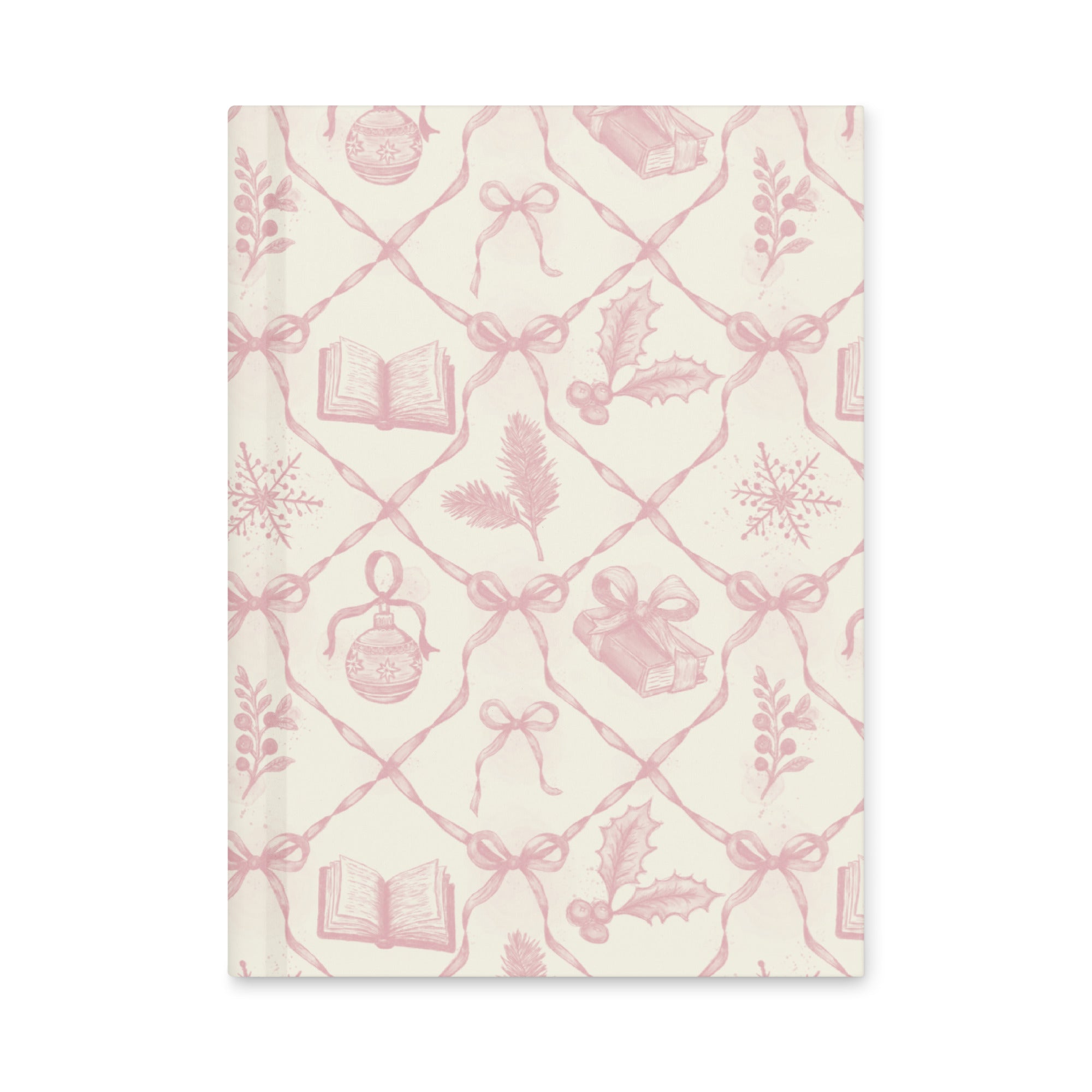 Featuring a hand-drawn and watercolor pattern of holly, books, and ribbons, this matte hardcover journal is ready for your daily thoughts, sketches, or divinations.